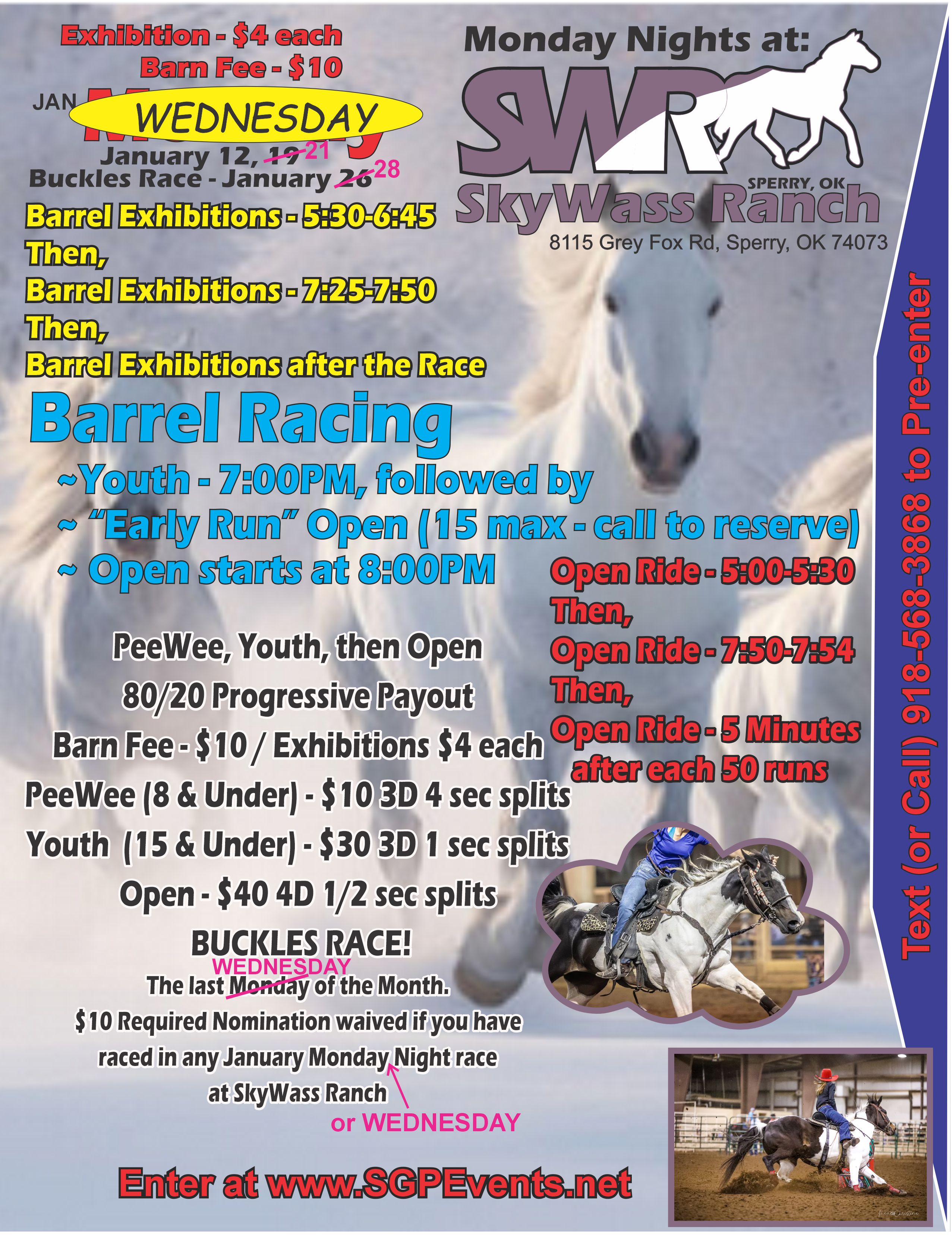 Monday... err, Wednesday Night at Skywass Ranch - 01/21/2026 - Skywass Ranch - Sperry, OK • 88 event entries • 57 horses in the event • Total Prize: $ 242.00