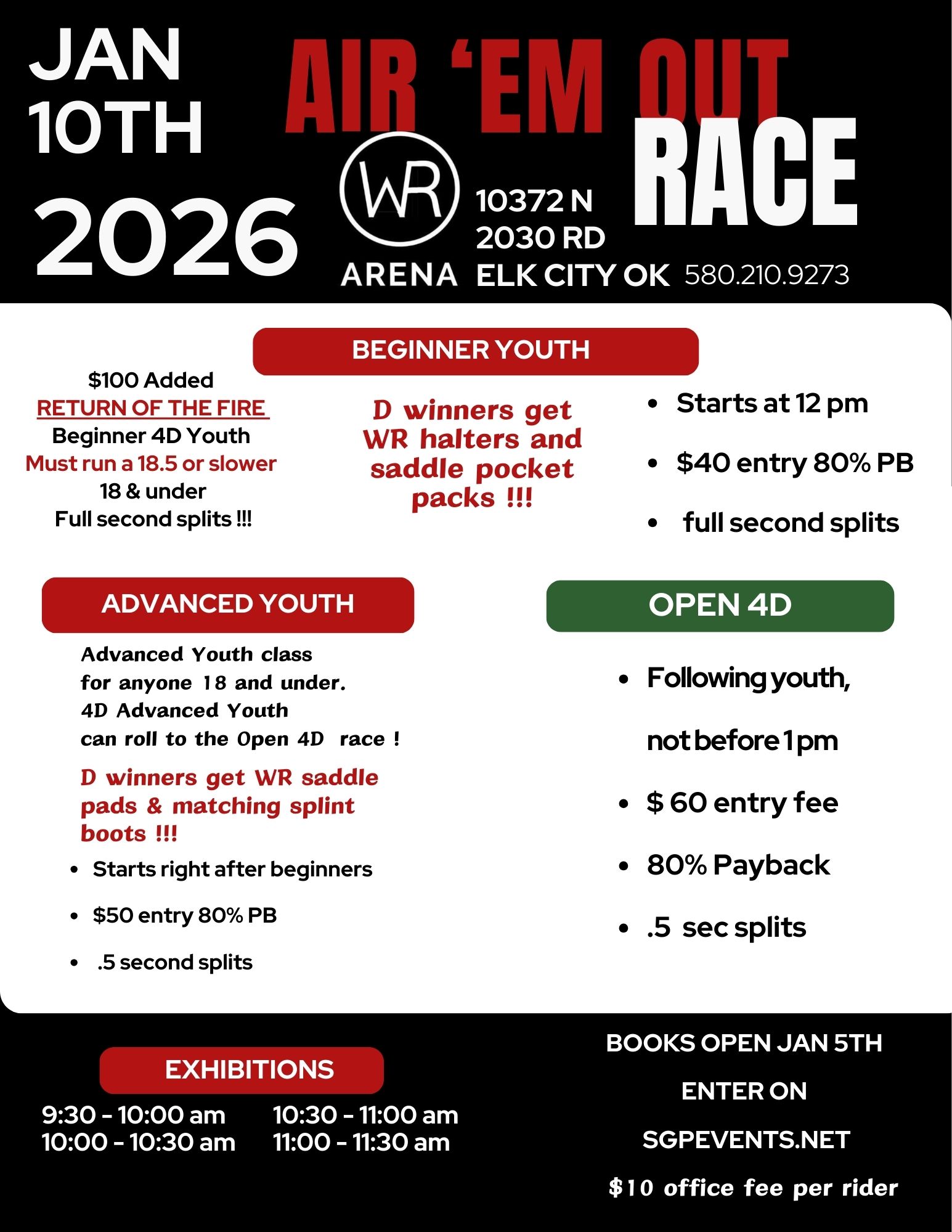 WR Productions Air Em Out - 01/10/2026 - WR Arena - Elk City, OK • 237 event entries • 140 horses in the event • Total Prize: $ 6,607.00