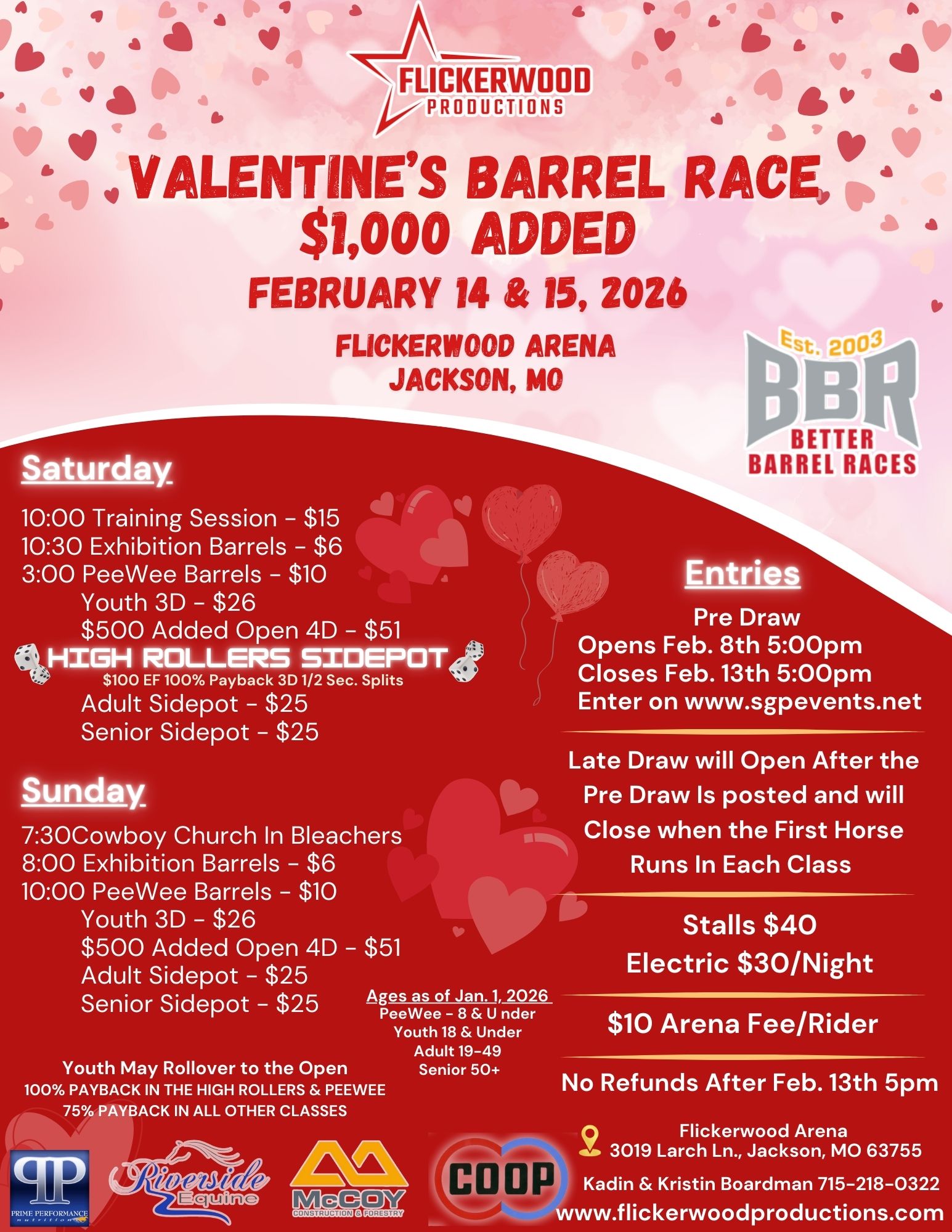 Flickerwood Productions Valentines Barrel Race - 02/14/2026 to 02/15/2026 - Flickerwood Arena - Jackson, MO • 598 event entries • 200 horses in the event • Total Prize: $ 14,711.00