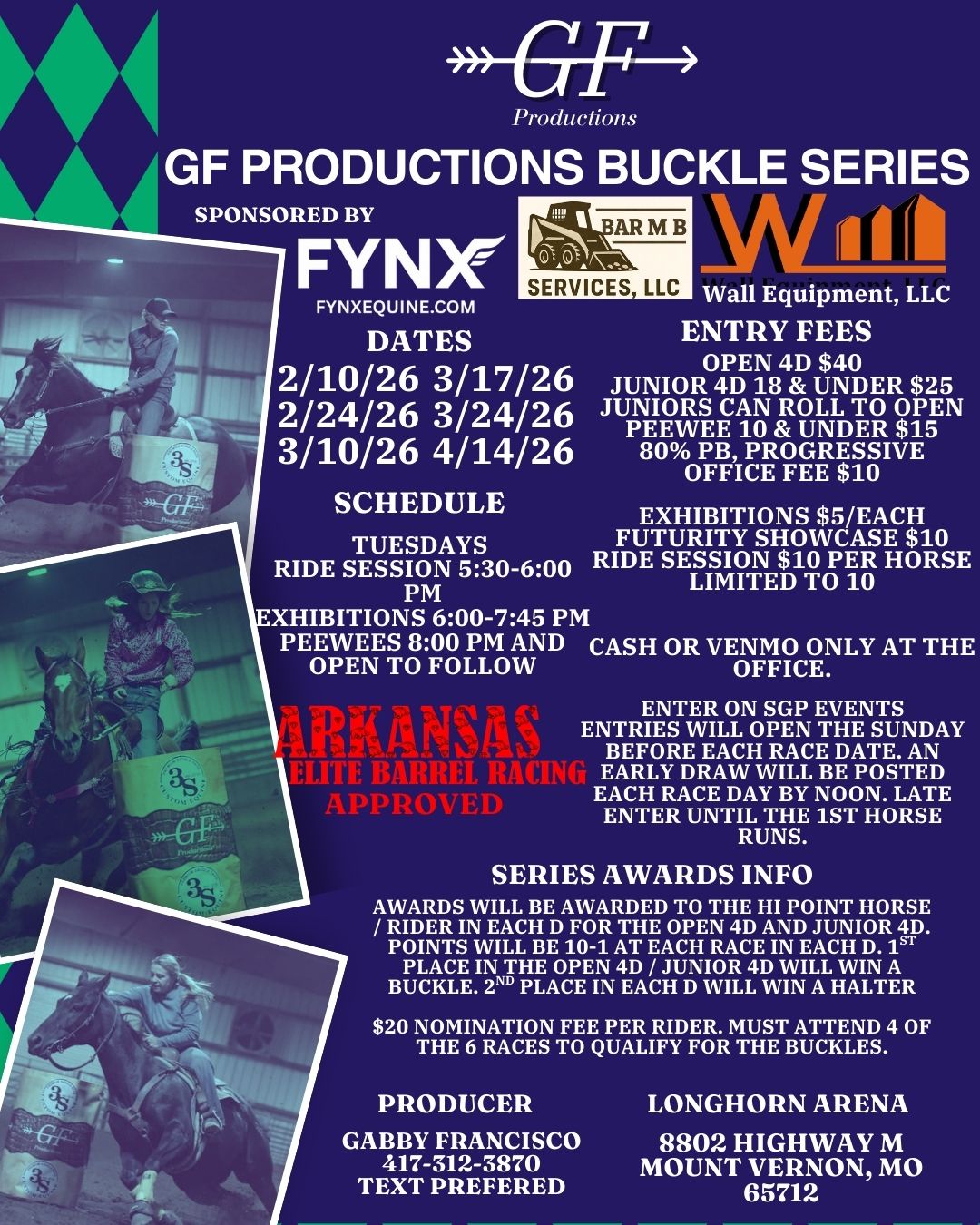 GF Productions Barrel Series - 03/10/2026 - Longhorn Arena - Mt. Vernon, MO • 213 event entries • 107 horses in the event • Total Prize: $ 3,185.00