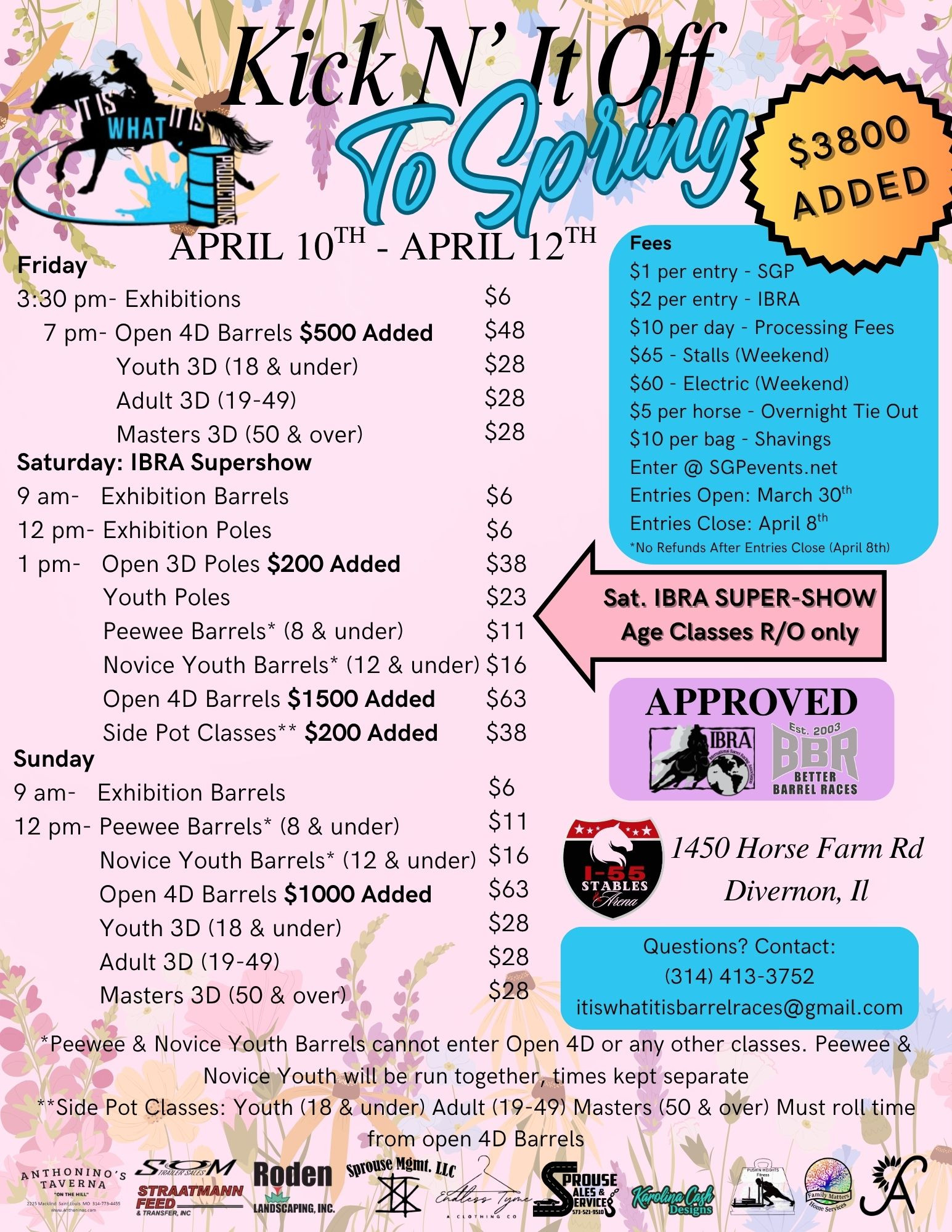Kick N It Off Spring Show - 04/11/2026 to 04/12/2026 - i55 Arena - Divernon, IL • 713 event entries • 197 horses in the event • Total Prize: $ 19,849.00