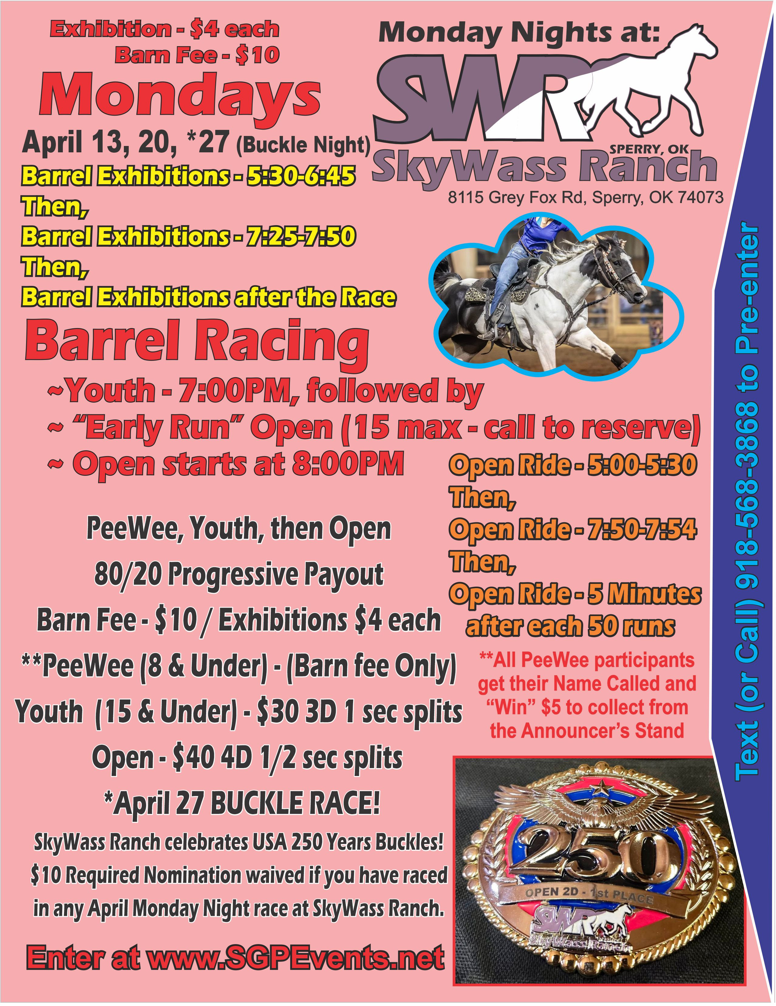Monday Night at Skywass Ranch - 04/13/2026 - Skywass Ranch - Sperry, OK • 78 event entries • 41 horses in the event • Total Prize: $ 1,058.00