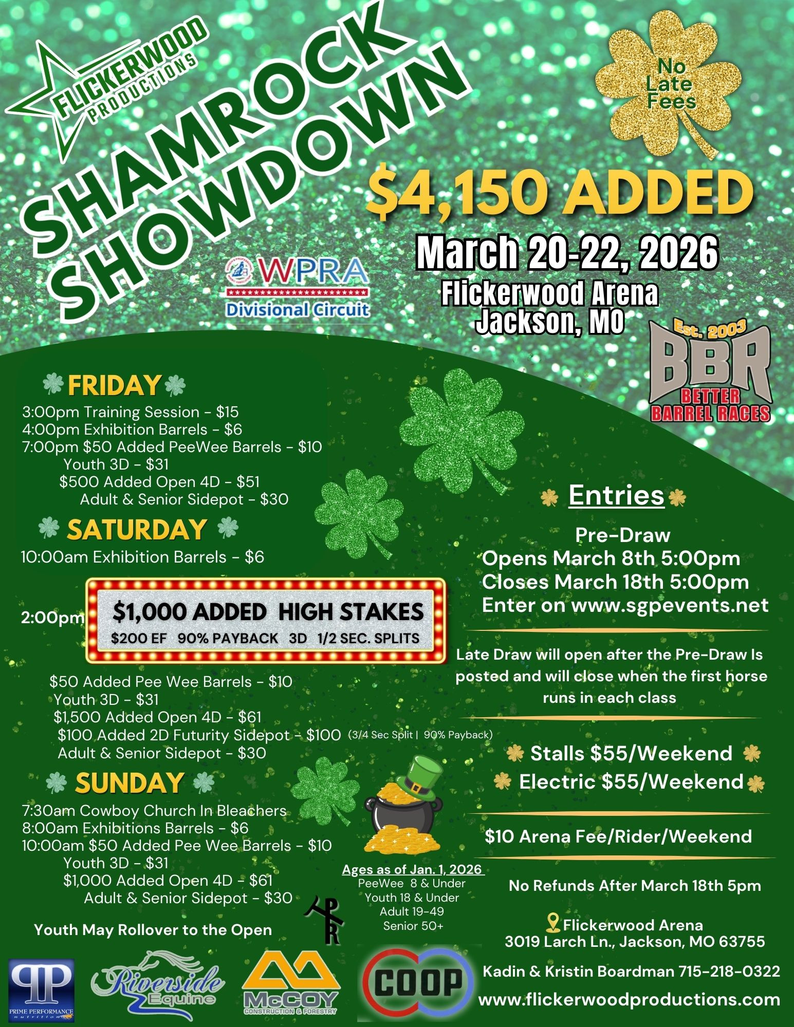 Flickerwood Productions Shamrock Showdown - 03/20/2026 to 03/22/2026 - Flickerwood Arena - Jackson, MO • 956 event entries • 301 horses in the event • Total Prize: $ 31,820.00