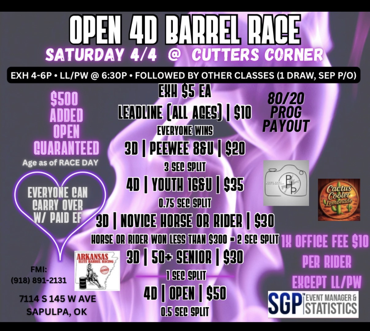 $500 ADDED • SSP Productions Open 4D - 04/04/2026 - Cutters Corner - Sapulpa, OK • 78 event entries • 33 horses in the event • Total Prize: $ 0.00