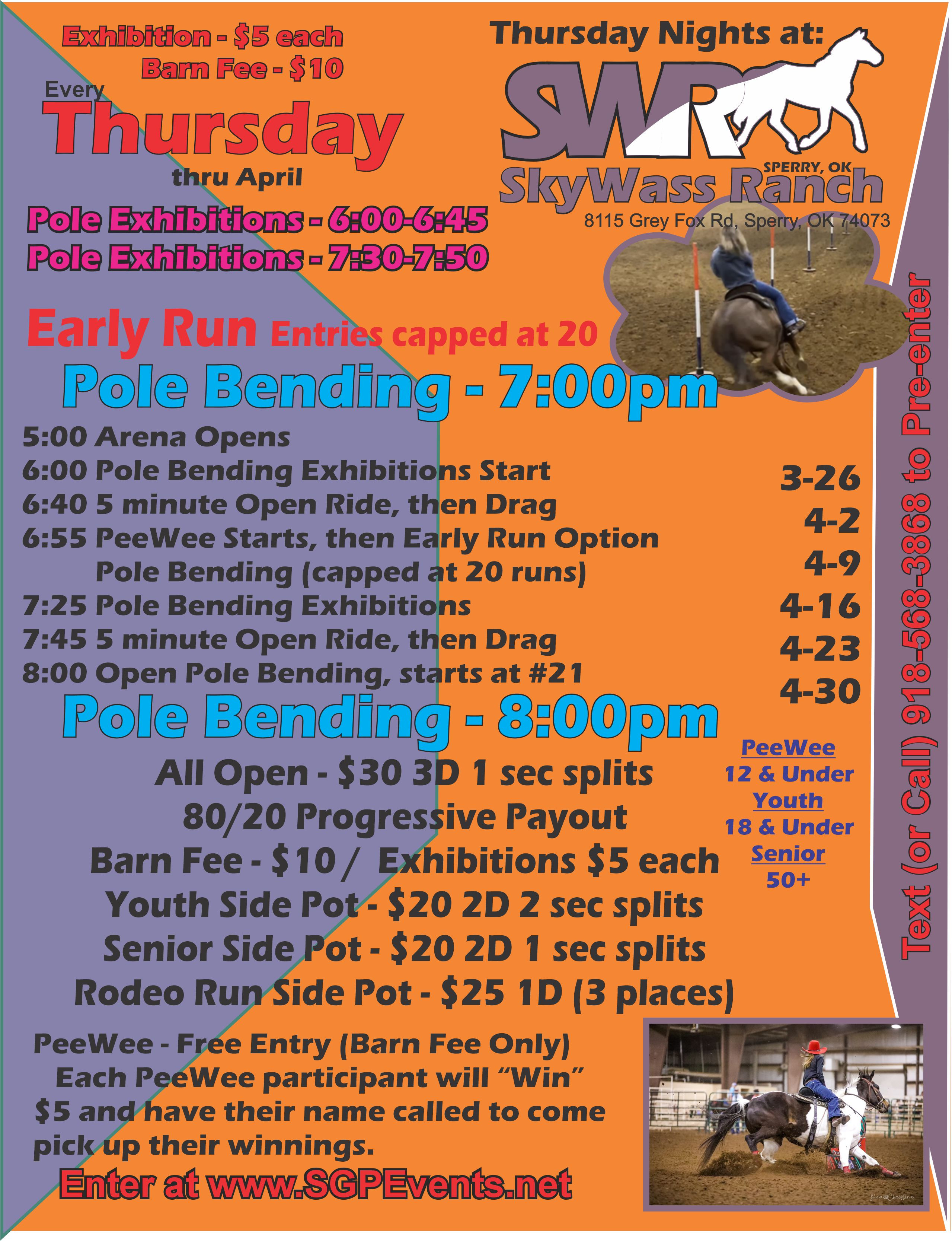 Skywass Ranch Pole Bending - 04/02/2026 - SkyWast Ranch - Sperry, OK • 7 event entries • 3 horses in the event • Total Prize: $ 126.00