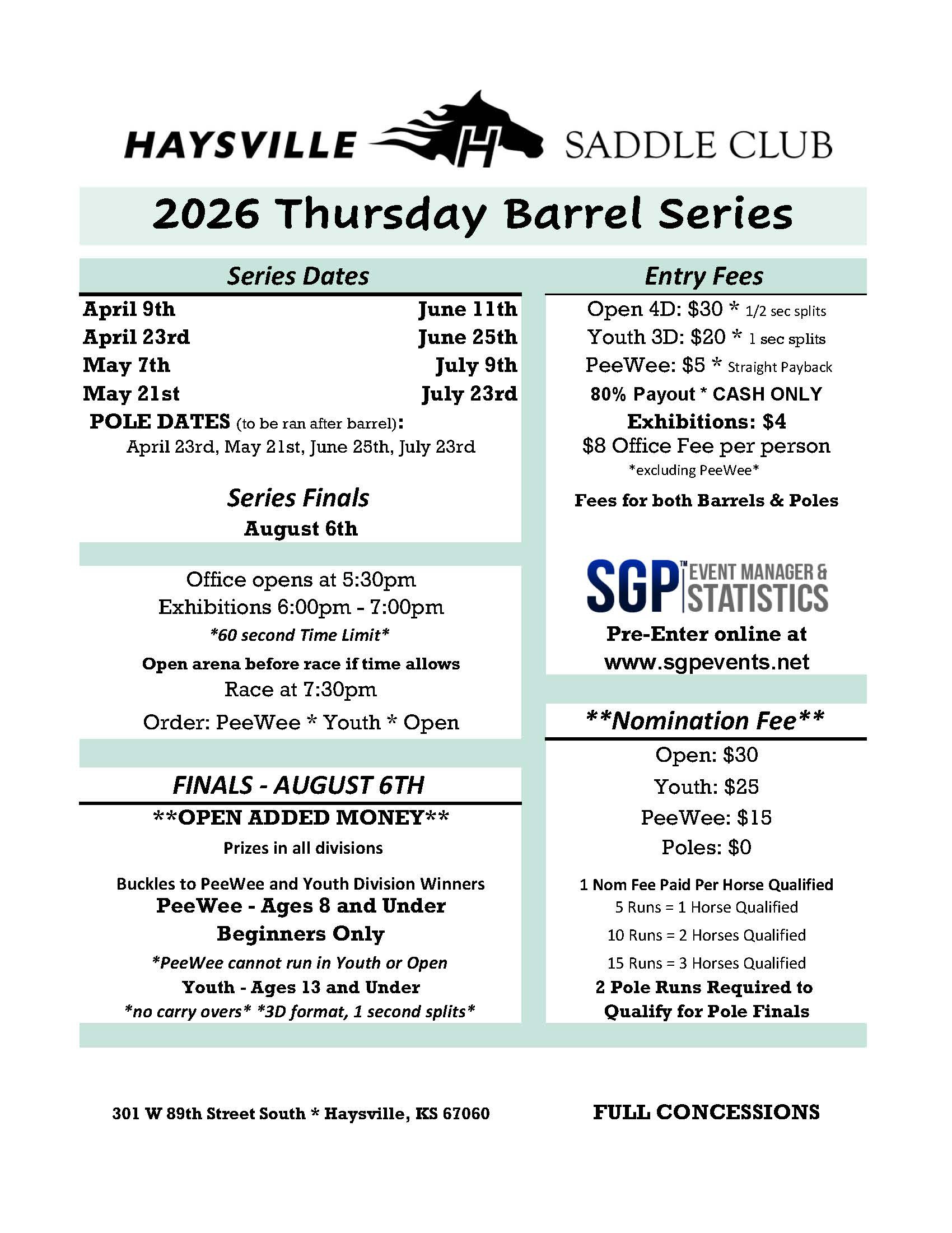 Haysville Saddle Club Barrel and Poles Series - 06/25/2026 - Haysville Saddle Club - Haysville, KS
